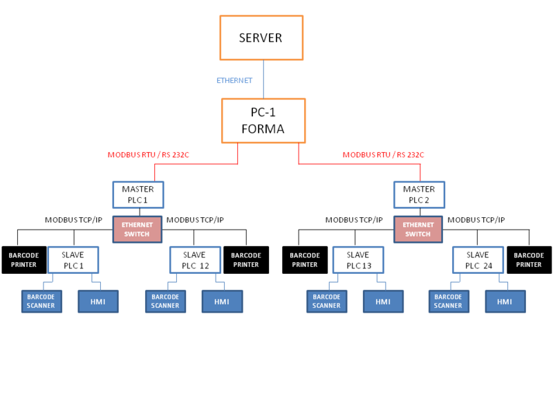Aşağıda; Penti Çorap San. Tic AŞ. için işletme şartları ve gerekliliklerine göre özel olarak tasarlanmış ve tamamı firmamız bünyesinde projelendirilip gerekli PC - PLC - HMI programları yazılarak devreye alınmış olan işletme imalat ve verimlilik takibi sisteminin akış ve haberleşme şeması basitçe gösterilmiştir.